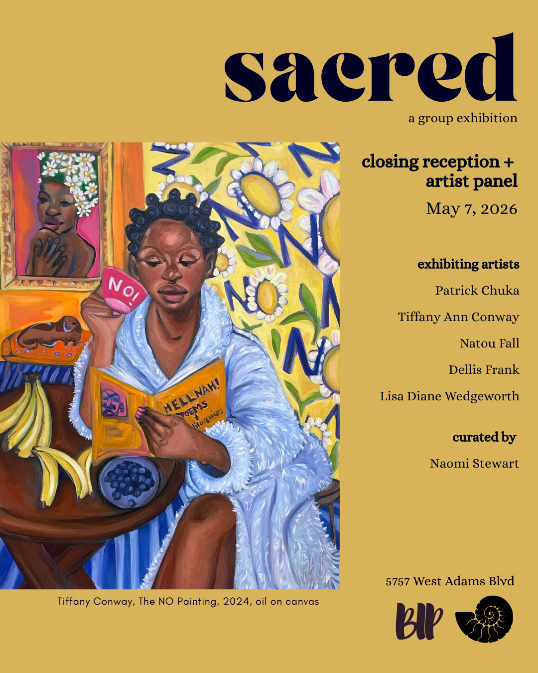 sacred includes artists Patrick Chuka, Tiffany Ann Conway, Dellis Frank, Natou Fall, and Lisa Diane Wedgeworth. Through their art practices, which alchemize grief, embrace rest, and celebrate creativity, the artists weave threads of resilience that honor both personal and collective healing.